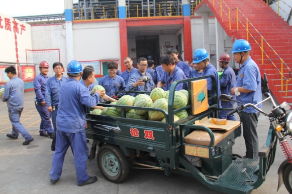 7月13日下午两点,顶着炎炎烈日,总经理宋万良、副总经理王建华亲自将防暑降温品送到车间岗位,亲手将西瓜和饮料送到了员工手中,同时向员工表达了公司的慰问和鼓励,希望员工克服困难,坚守岗位,发挥自身作用,创造更好的业绩。员工们兴高采烈地接过慰问品,对公司领导的关心和关怀表示感谢。